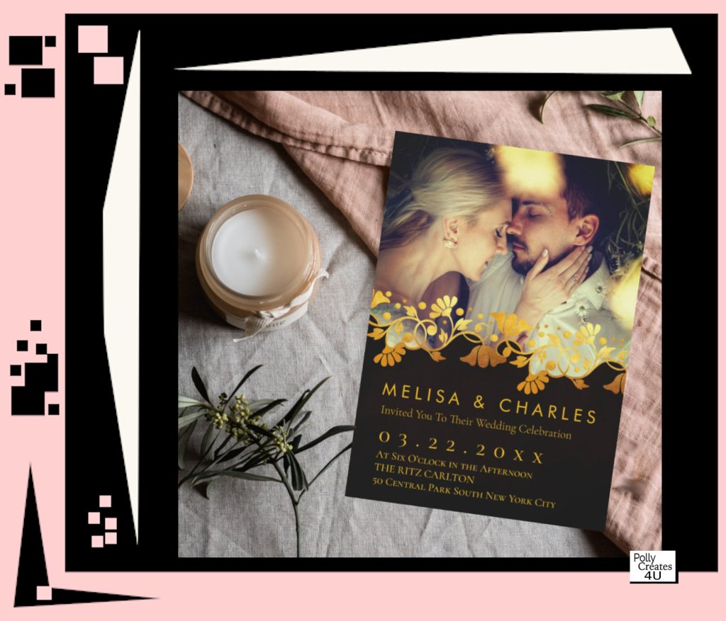 Luxurious and sophisticated photo wedding invitation with flourish gold monogram.